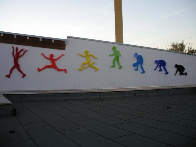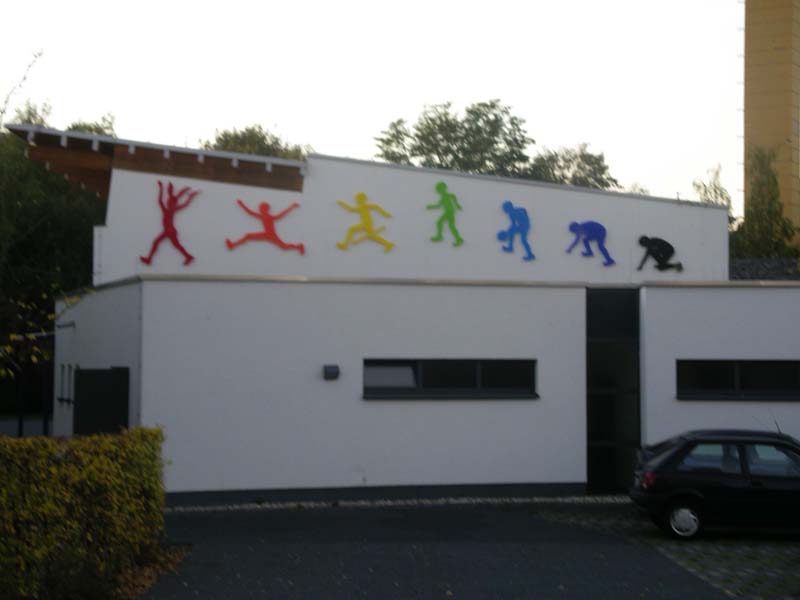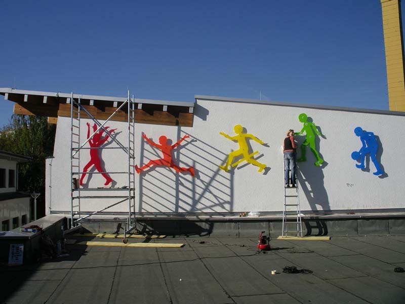 Es handelt sich hier um die Gestaltung der Aussenfassade einer Schule, welche durch überlebensgroße Figuren aus Kunststoff (PMMA) belebt wurde.